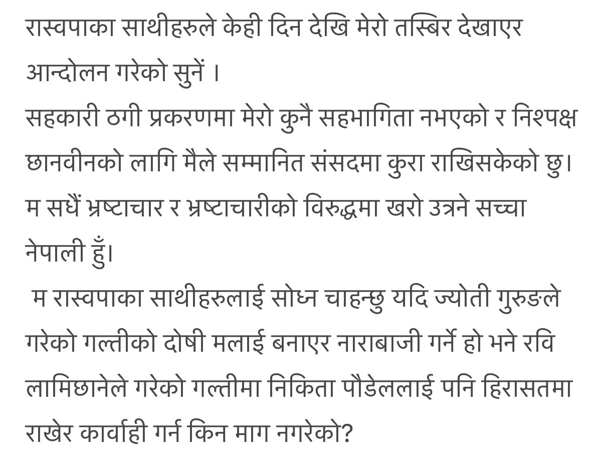 उनले रास्वपाका कार्यकर्ताले आफ्नो तस्बिर राखेर आन्दोलन गरिरहेको भन्दै गम्भीर ध्यानाकर्षण भएको जनाएका छन्। उनले ज्योति गुरुङले गरेको गल्तीको दोषी मलाई बनाएर नाराबाजी गर्ने हो भने रवि लामिछानेले गरेको गल्तीमा निकिता पौडेललाई पनि हिरासतमा राखेर कारबाही किन नगरेको भनेर प्रश्न गरेका छन्।