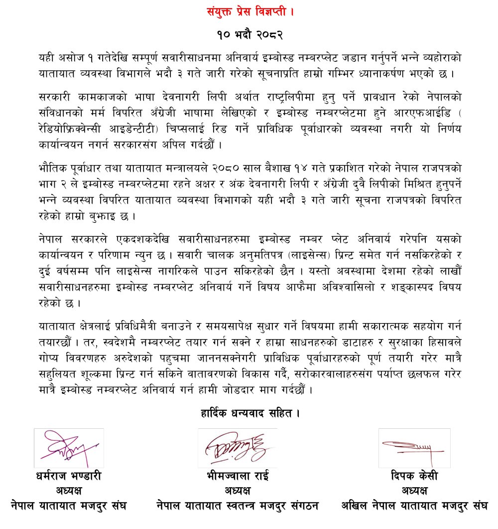काठमाडौं — यातायात मजदुरसँग सम्बन्धित तीन संगठनहरूले पूर्वाधार तयार नगरी १ असोजदेखि इम्बोस्ड नम्बर प्लेट अनिवार्य नगर्न सरकारसँग माग गरेका छन्।