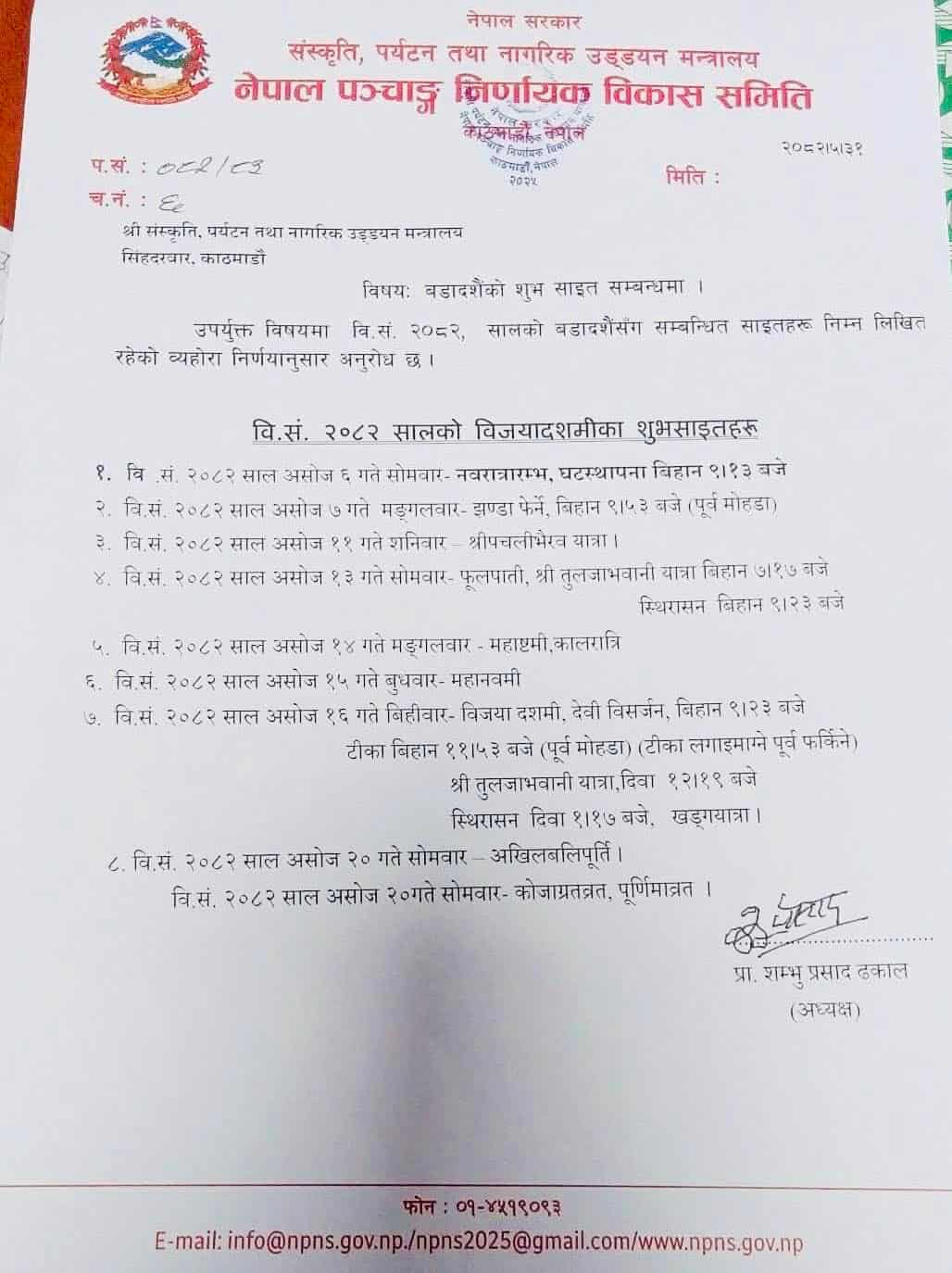 नेपाल पञ्चांग निर्णायक विकास समितिले मंगलबार सार्वजनिक गरेको विज्ञप्तिअनुसार दसैंको मुख्य दिनहरूको मिति निम्नानुसार रहेका छन्