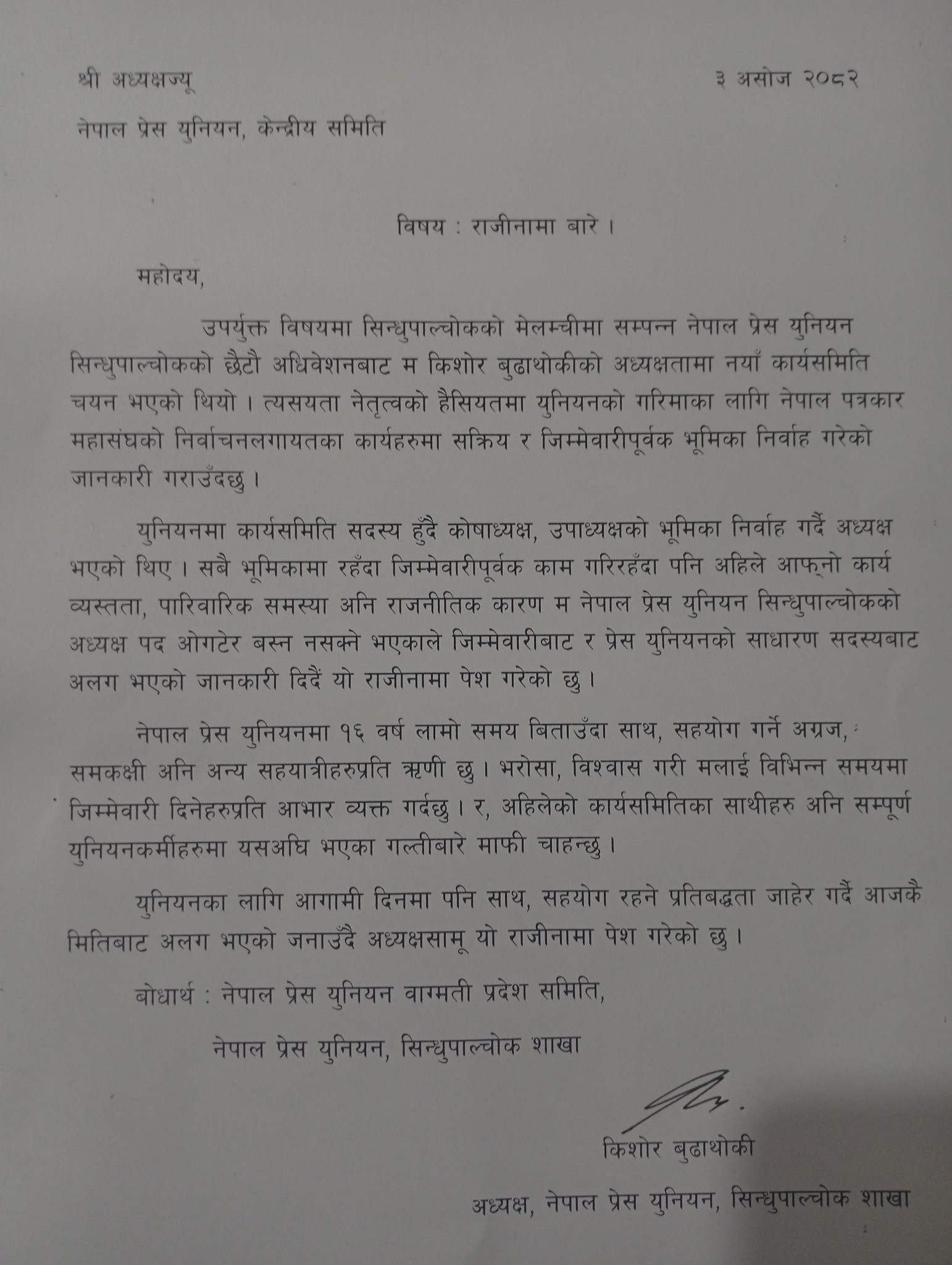 सिन्धुपाल्चोक । नेपाल प्रेस युनियन, सिन्धुपाल्चोक शाखाका अध्यक्ष किशोर बुढाथोकीले आफ्नो पदबाट राजीनामा दिएका छन्। छैठौं अधिवेशनमार्फत अध्यक्षमा निर्वाचित भएका बुढाथोकीले व्यक्तिगत, पारिवारिक र राजनीतिक कारण देखाउँदै पद छाड्ने घोषणा गरेका हुन्।