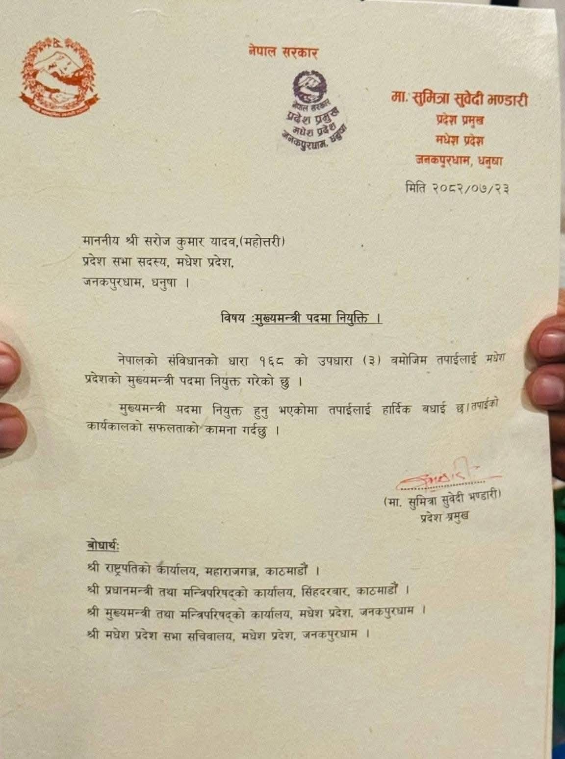काठमाडौं: मधेश प्रदेशमा राजनीतिक घटनाक्रमले अप्रत्याशित मोड लिएको छ। निवर्तमान मुख्यमन्त्री जितेन्द्र सोनलको राजीनामापश्चात् प्रदेश प्रमुख सुमित्रा सुवेदी भण्डारीले नेकपा एमाले संसदीय दलका नेता सरोजकुमार यादवलाई मुख्यमन्त्री नियुक्त गरेकी छन्।