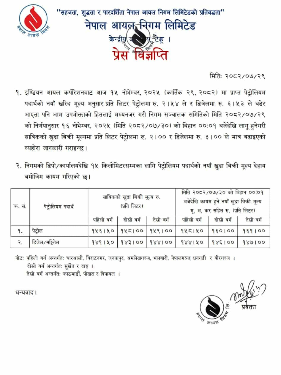 निगमले आइतबार (कात्तिक ३०) बिहानदेखि लागु हुने गरी पेट्रोलको मूल्य लिटरमा दुई रुपैयाँले बढाएको छ । डिजेलको मूल्य लिटरमा तीन रुपैयाँले बढाइएको छ ।