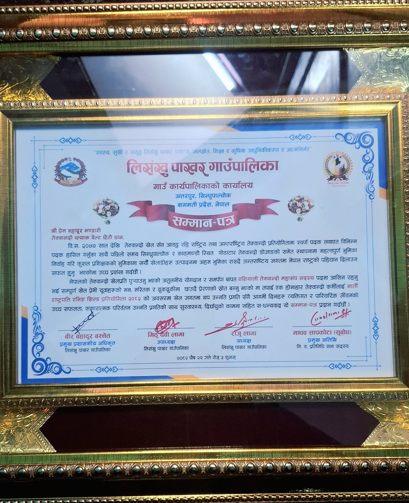उनलाई प्रदान गरिएको यो सम्मानलाई नेपाली तेक्वान्दो क्षेत्रको प्रेरणादायी उपलब्धि का रूपमा लिइएको छ भने नयाँ पुस्ताका खेलाडीहरूका लागि उत्साह र मार्गदर्शनको स्रोत बन्ने अपेक्षा गरिएको छ।