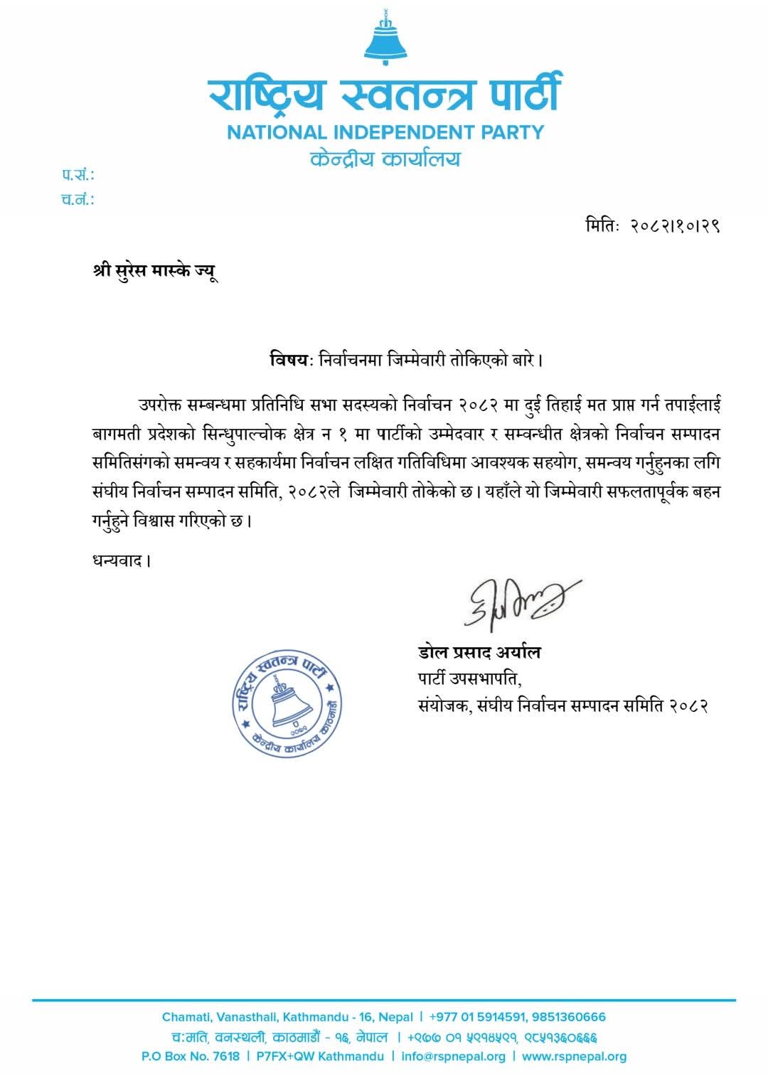 पार्टीको उम्मेदवारलाई दुई तिहाइ मतसहित विजयी गराउने स्पष्ट लक्ष्यसहित श्री सुरेस मास्केलाई क्षेत्रीय निर्वाचन सम्पादन समितिसँग समन्वय र सहकार्य गर्दै सम्पूर्ण निर्वाचन केन्द्रित गतिविधि प्रभावकारी रूपमा अघि बढाउने जिम्मेवारी प्रदान गरिएको हो।
