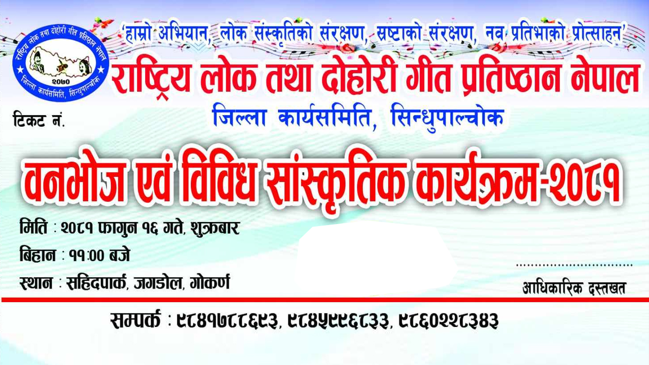 लोक तथा दोहोरी गीत प्रतिष्ठान सिन्धुपाल्चोकद्वारा वनभोज तथा सांस्कृतिक कार्यक्रम आयोजना हुने